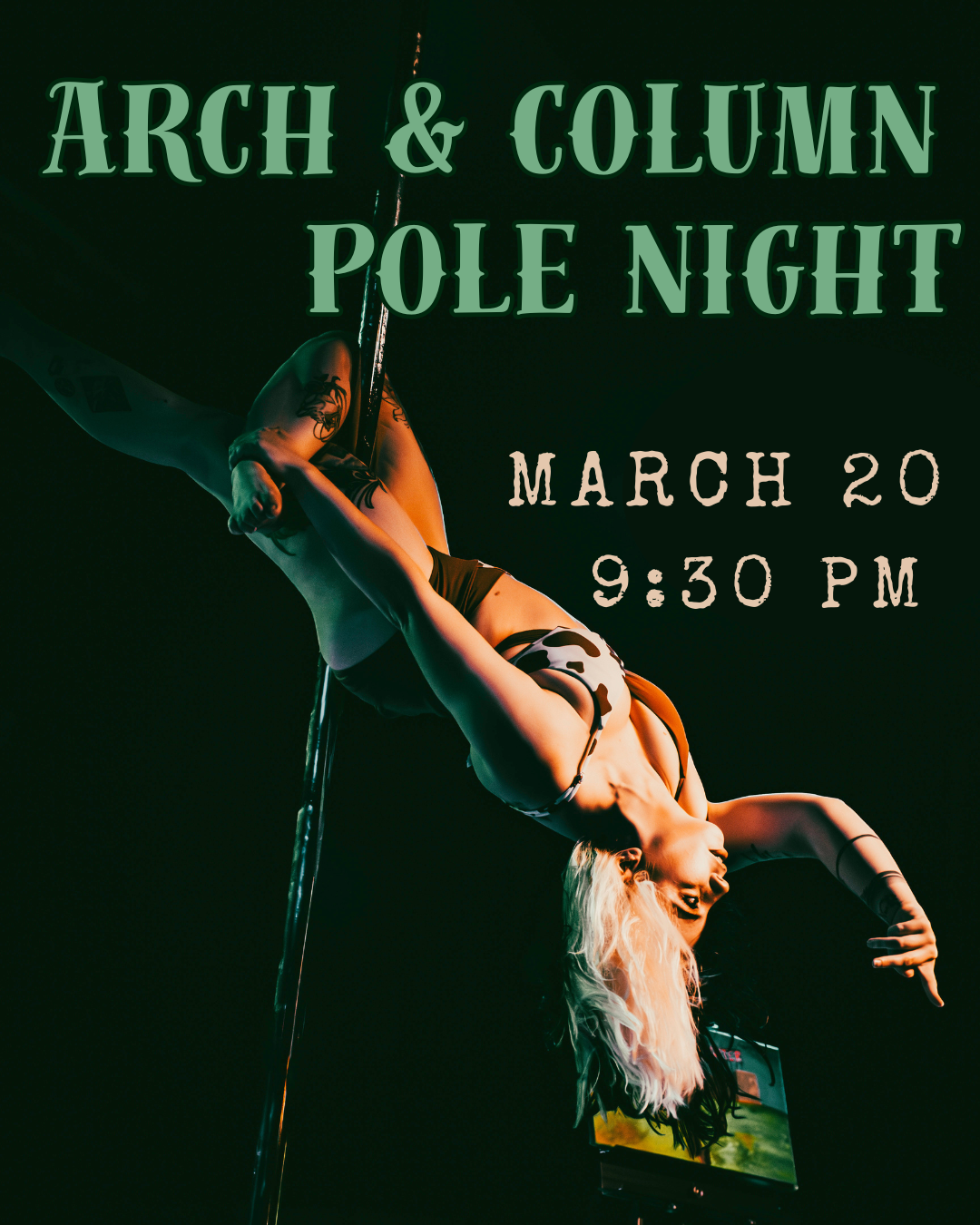 Join us in our monthly Muse Nights @ Arch & Column featuring the Muse Pole Fitness competition & performance team. Enjoy a series of freestyle pole performances in this event benefitting our competitive performers. There is no cover fee, but tips are welcome and encouraged to help support the performers.